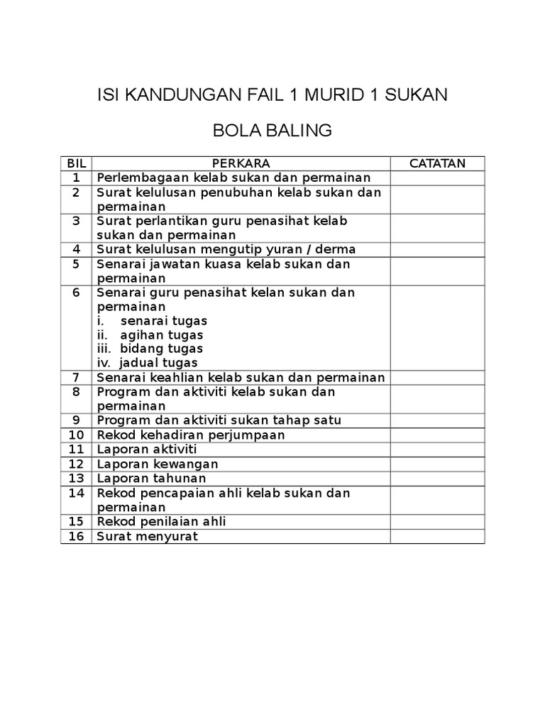 Senarai semak fail bagi badan beruniform kelab dan persatuan sukan dan permainan bil pengurusan fail ada tiada catatan semakan pertama penyelaras 20 tindakan guru penasihat 20 1 surat permohonan penubuhan draf perlembagaan draf aktiviti asal senarai jawatan kuasa penaja 2 surat kelulusan penubuhan persatuan 3 surat. Menyenaraikan aktiviti sukan serta alatan untuk acara sukan di sekolah. Minit mesyuarat hendaklah diserahkan masing-masing.